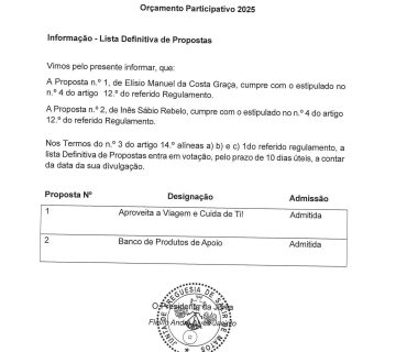Pela ausência de reclamações, a lista passa de provisória a definitiva e após esse prazo e nos Termos do n.º 3 do artigo 14.º alíneas a) b) e c) 1 do referido regulamento, a lista Definitiva de Propostas entra em votação presencial na sede da Junta de Freguesia, pelo prazo de 10 dias úteis, a contar da data da sua divulgação.