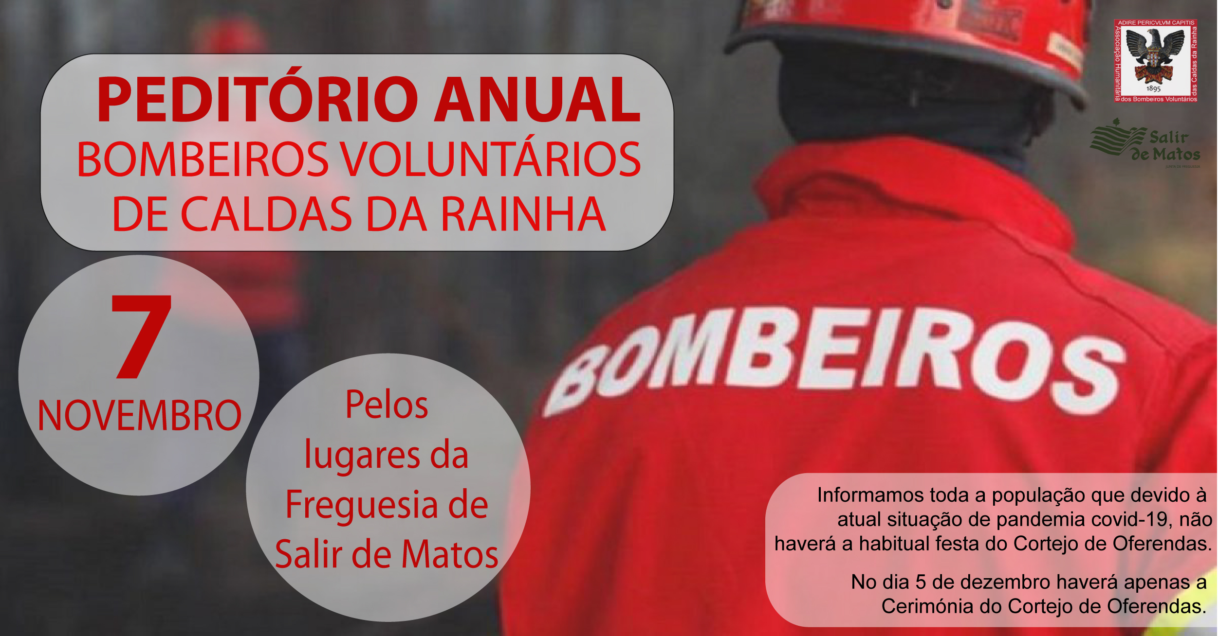 Informamos que, o Peditório Anual dos Bombeiros Voluntários de Caldas da Rainha, irá decorrer no dia 7 de novembro de 2021, pelos lugares da Freguesia de Salir de Matos, será realizado por pessoas conhecidas acompanhadas por um elemento dos Bombeiros.
